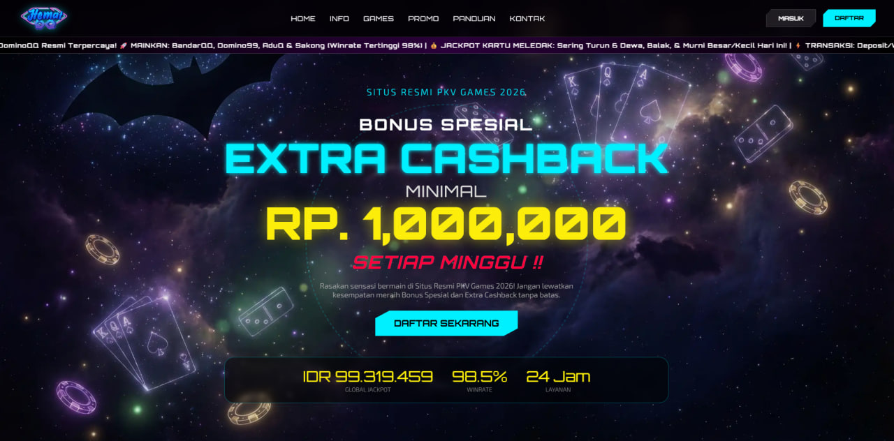 HematQQ menghadirkan ekosistem permainan terlengkap dengan teknologi Sistus PKV Games 2026. Nikmati akses eksklusif ke 18+ game kartu populer (BandarQ, DominoQQ, Poker) dan Slot Gacor hanya dengan 1 User ID. Didukung sistem 100% Fairplay dan Winrate tertinggi, kami menjamin pengalaman bermain yang stabil, adil, dan penuh peluang Jackpot setiap harinya.